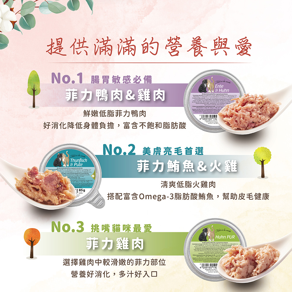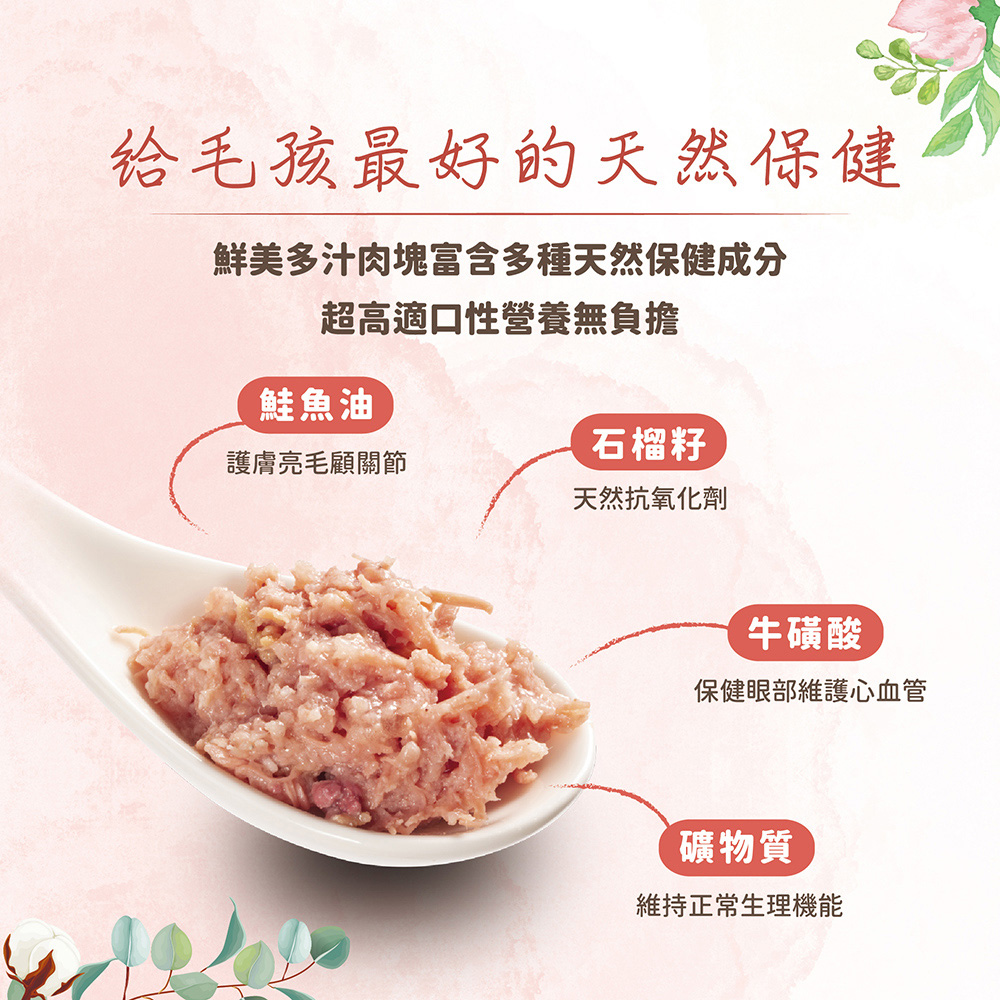 鮮肉原塊+肉湯含量高達92%,皆添加1%石榴籽+1%礦物質,以及6%鮭魚油等優質油源,給寶貝滿滿的營養與愛。