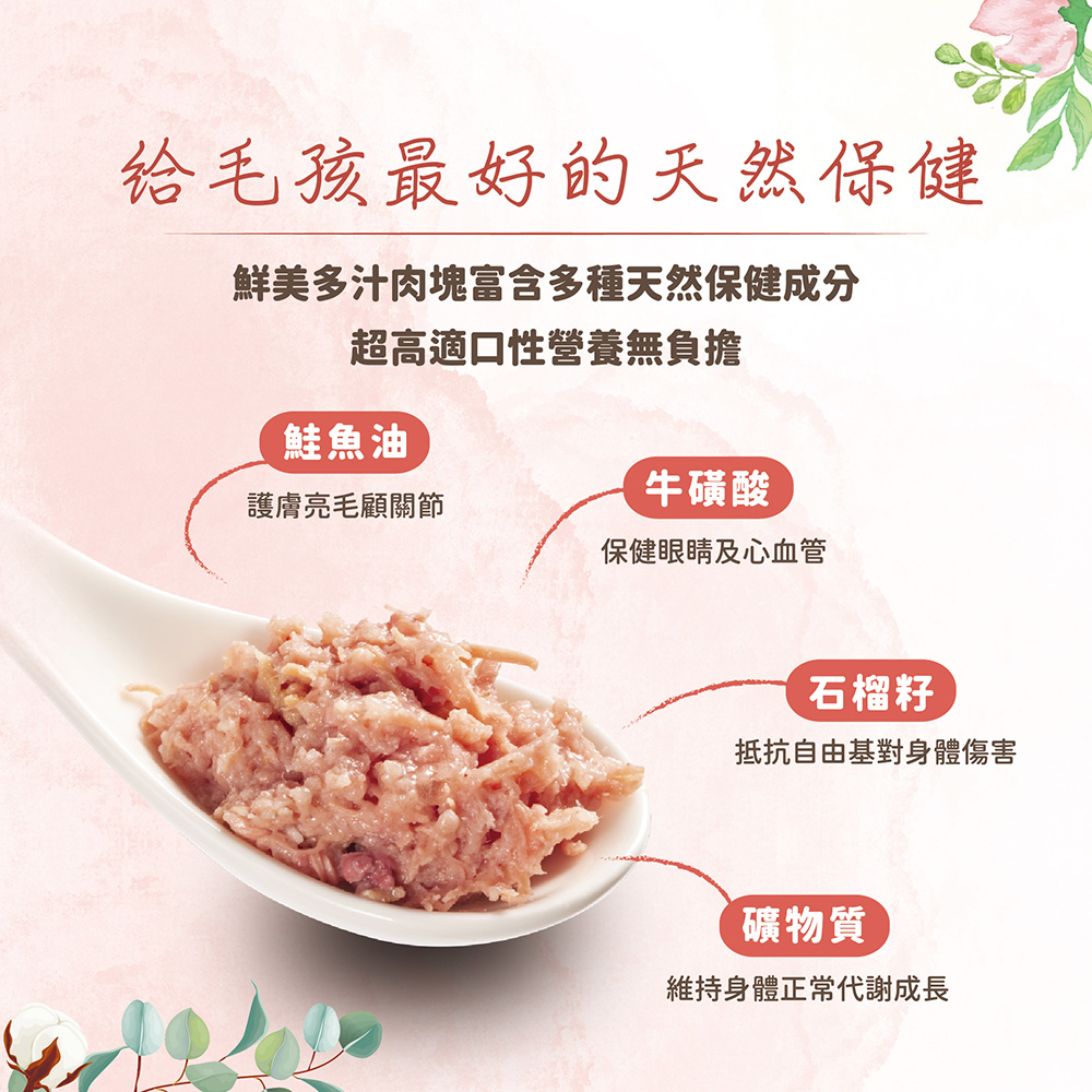 鮮肉原塊+肉湯含量高達92%,皆添加1%石榴籽+1%礦物質,以及6%鮭魚油等優質油源,給寶貝滿滿的營養與愛。