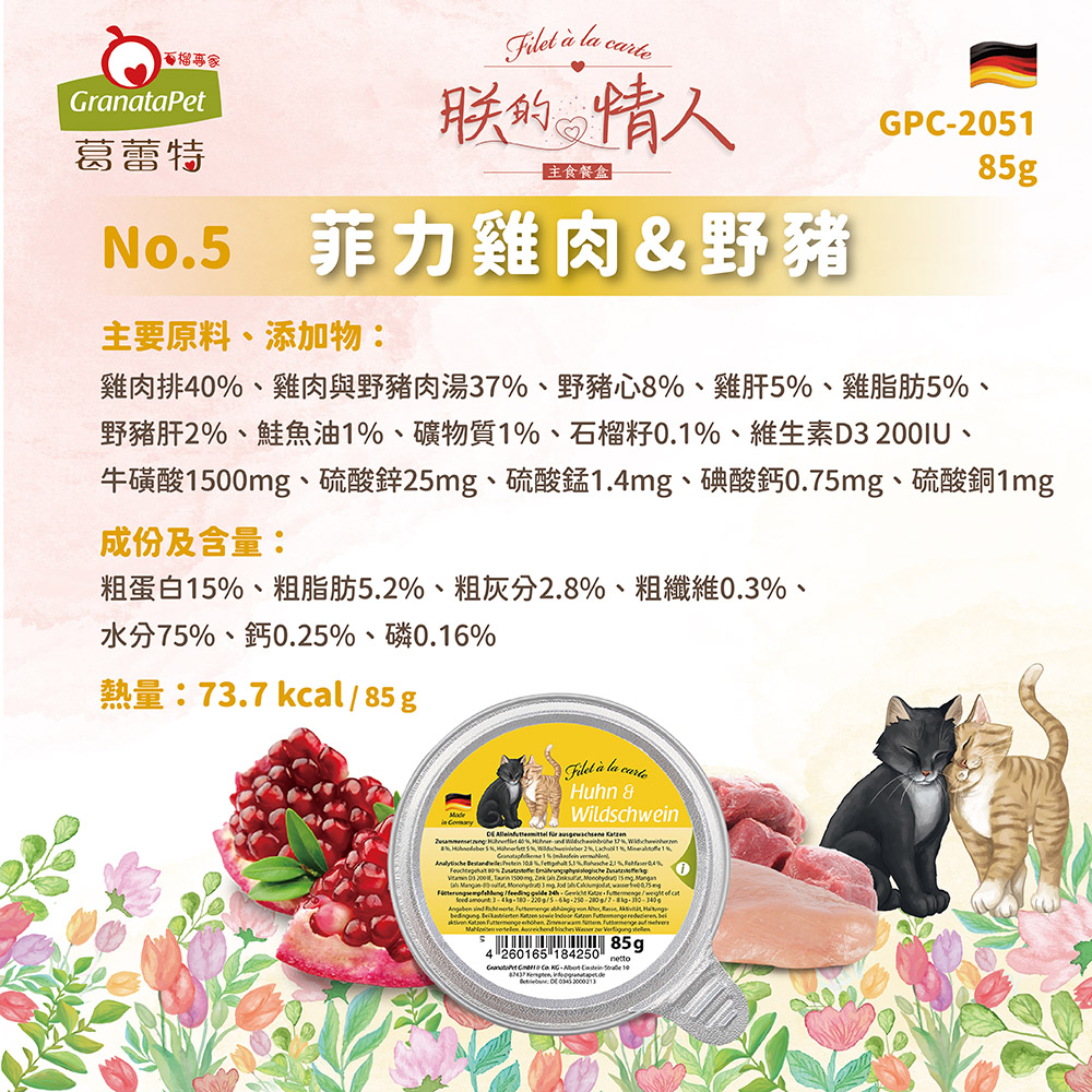 與愛貓們的味蕾約會,讓他們感受無限的愛與呵護!GranataPet 朕的情人主食貓餐盒1號,含40%雞肉菲力為優質蛋白質提供來源,搭配鴨與雞肉湯、內臟食材溫火燉煮,提供豐富不飽和脂肪酸與維生素,完整保留食材原型。