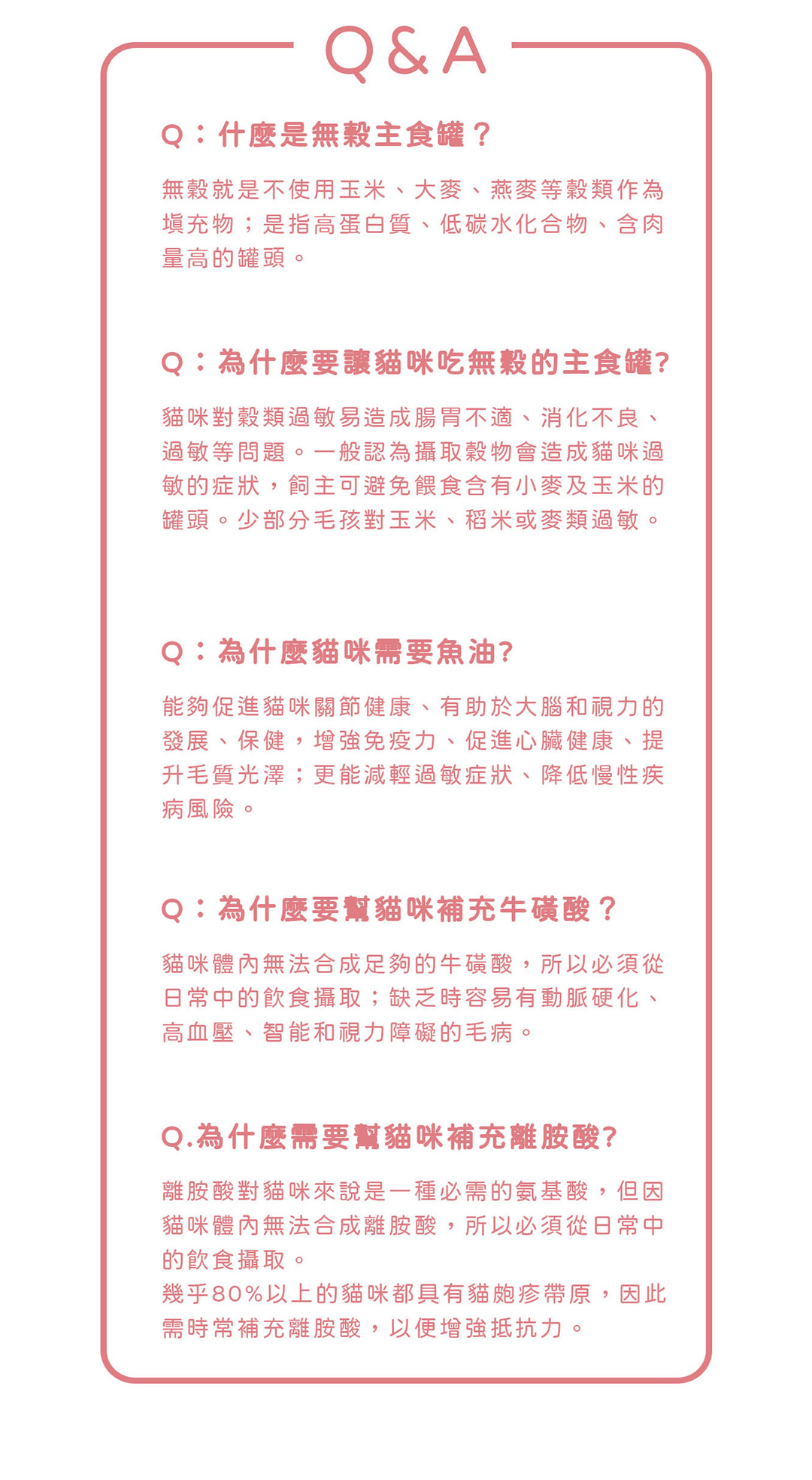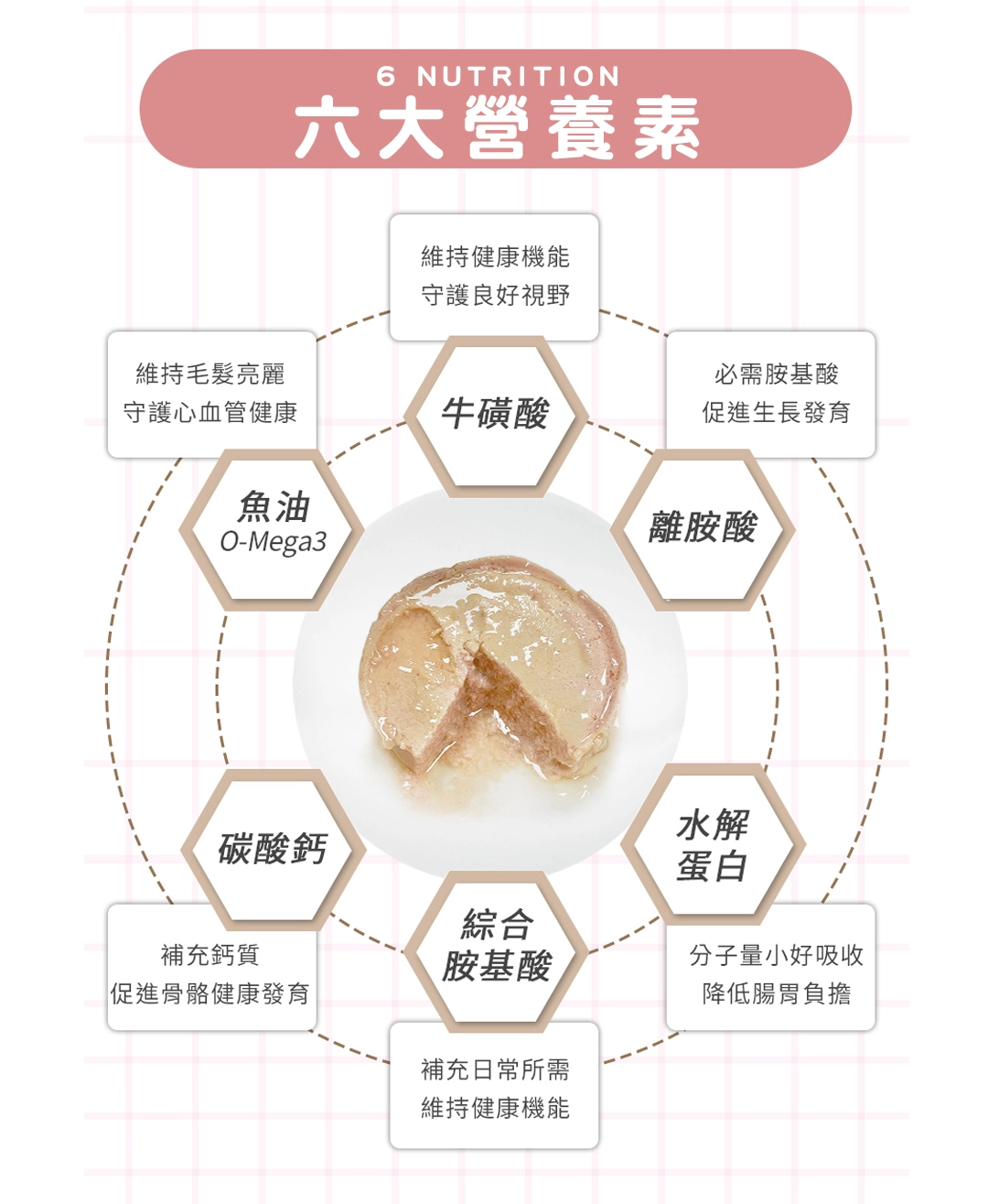 • 內含蛋白質、魚油、牛磺酸、離胺酸等營養