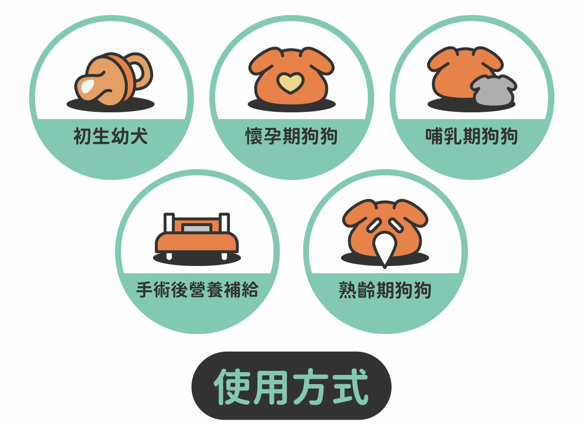 ※適合對象:初生幼犬、產前懷孕期、產後哺乳期、術後營養補充、熟齡犬的營養補給品